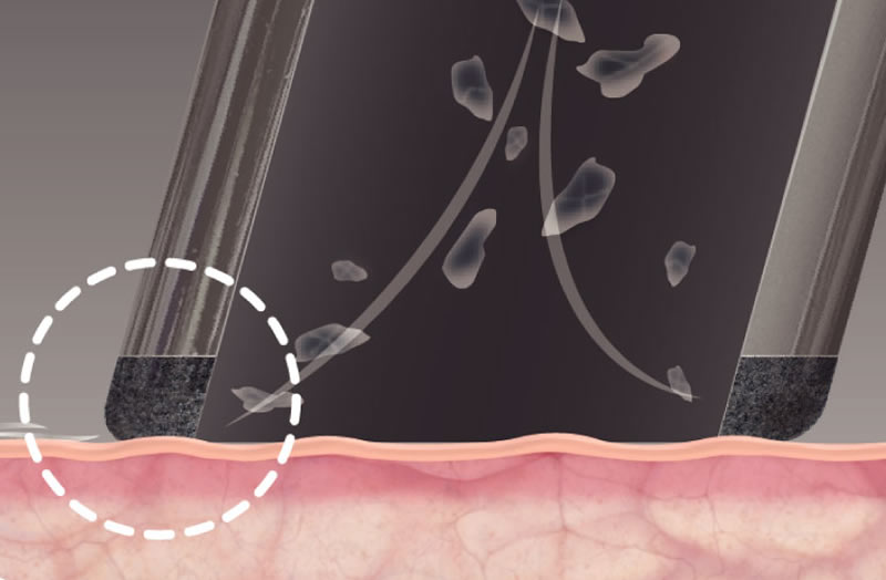 Activate the upper skin layer to remove dead cells, opens clogged pores, smooths the surface, and delivers O₂. The treatment enhances penetration of active ingredients into the skin. The Technology uses O₂ from ambient air to create a venturi effect that generates CO₂ rich environment that facilitates optimal absorption.