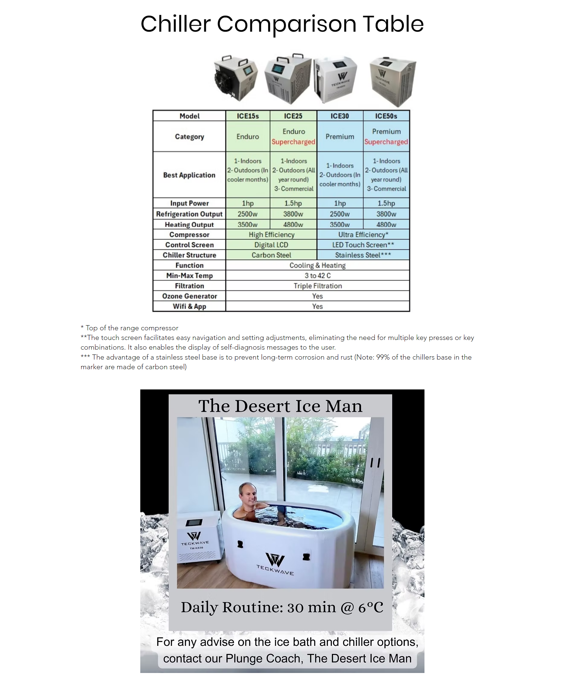 Our all-in-one package ensures a quick and hassle-free setup for your cold plunge in under 20 minutes. The chiller seamlessly integrates with our TECKWAVE app, providing convenient control and scheduling from anywhere.